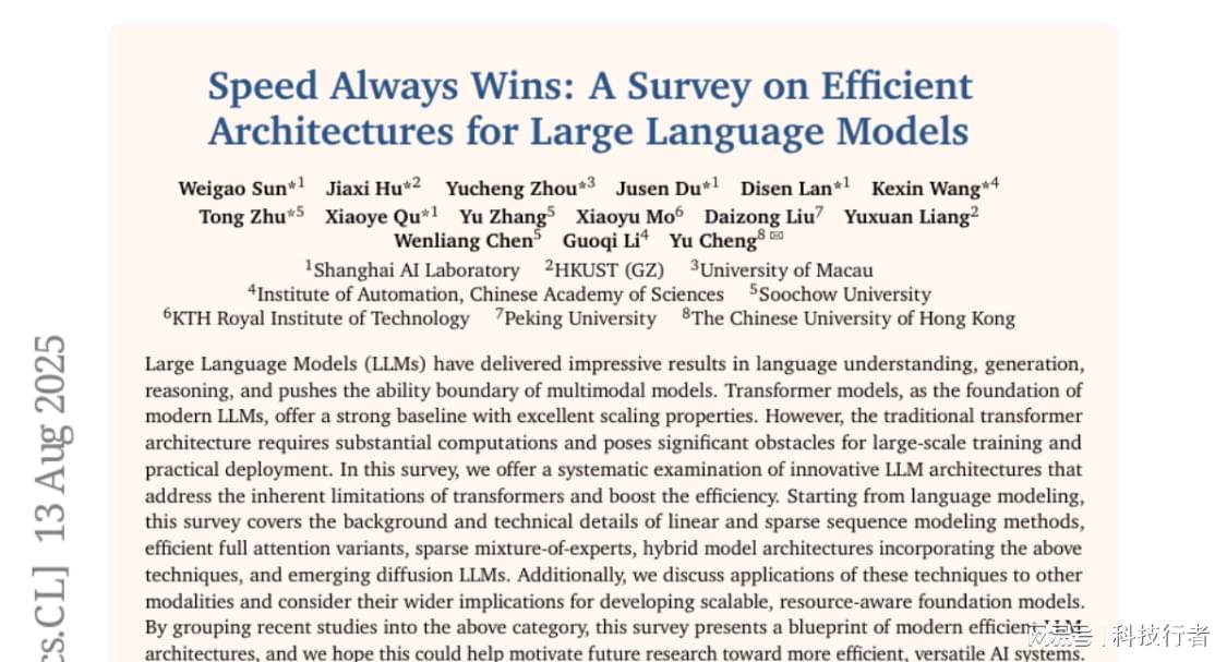 面对这个挑战,研究团队系统性地梳理了当前最前沿的解决方案,就像为这个\"AI交通拥堵\"问题制定了一份详尽的解决方案目录。他们将这些创新方法分为七个主要类别:线性序列建模、稀疏序列建模、高效全注意力、稀疏专家混合、混合架构、扩散大语言模型,以及跨模态应用。这些方案各有特色,就像不同的交通优化策略,有的专注于改善道路设计,有的着重于智能调度,有的则创造性地结合多种方法。
